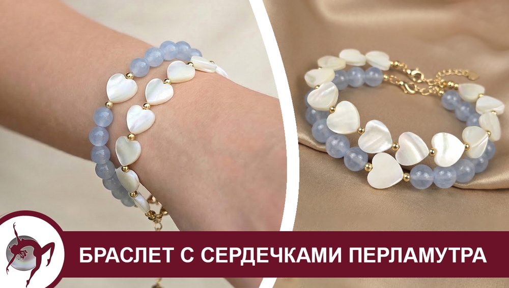 Идея, как собрать браслеты с бусинами сердечками перламутра и голубого кальцита