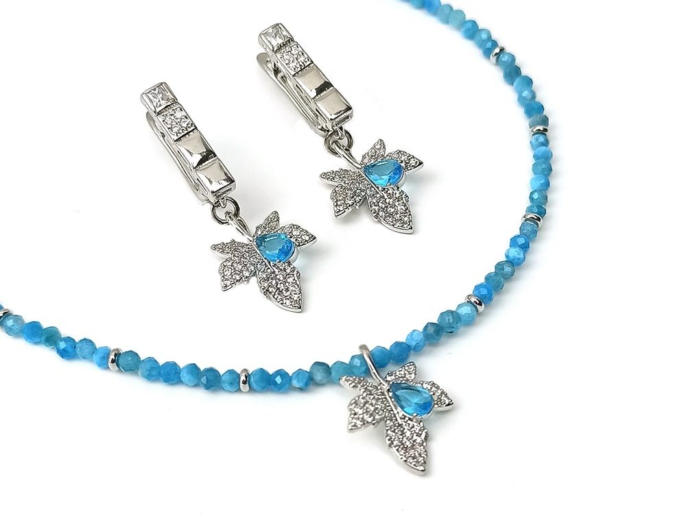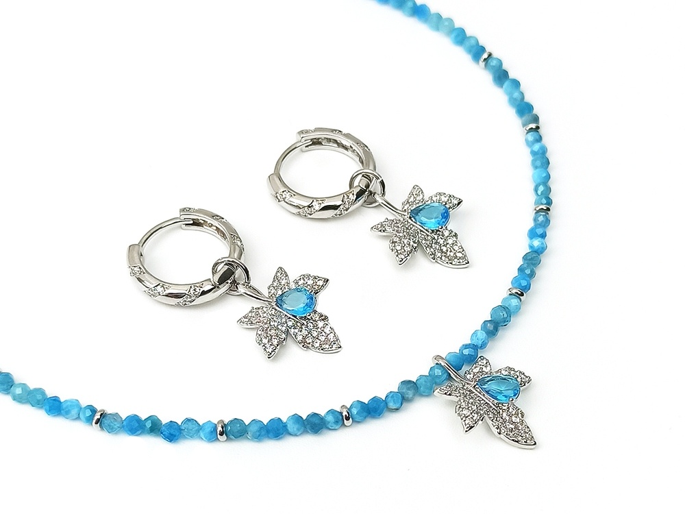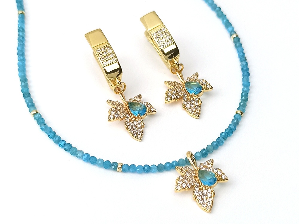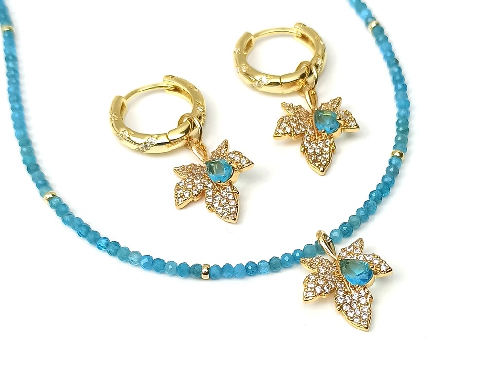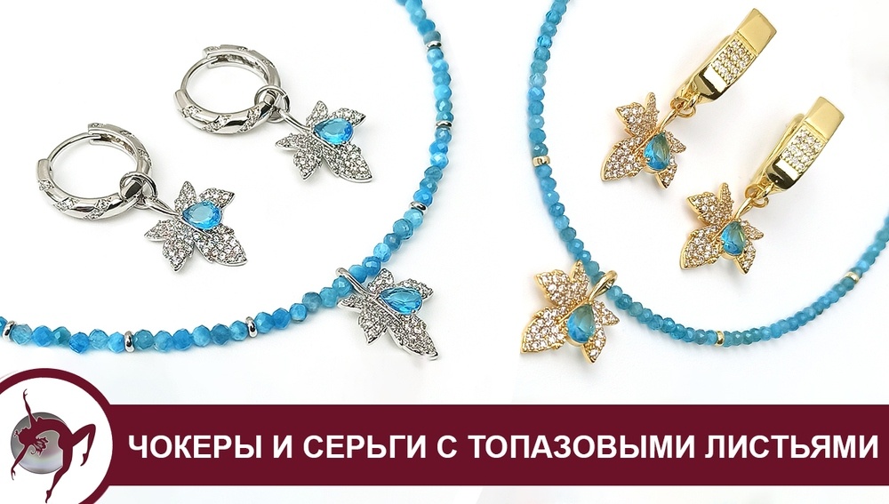 К золотым и серебряным листьям, украшенным красивыми топазовыми кристаллами каплями, подобраны бусины апатита в микроогранке. Можно собрать украшение со швензами конго или английский замок, в цвете золото или серебро. Основа для чокера - японский ювелирный тросик.