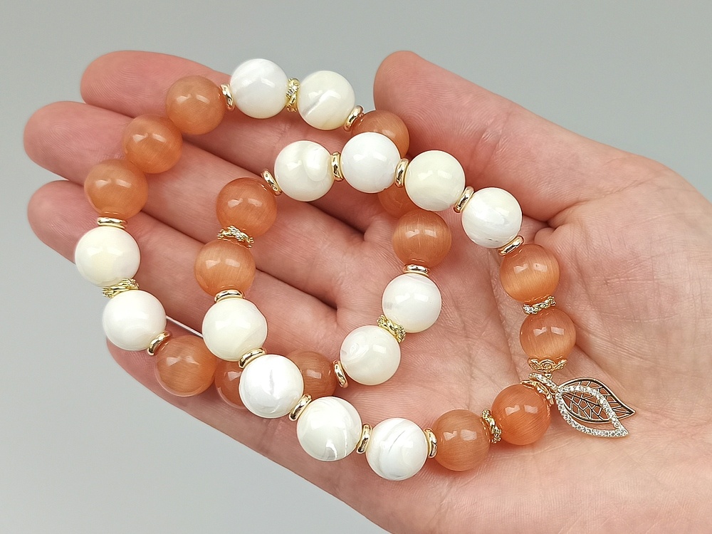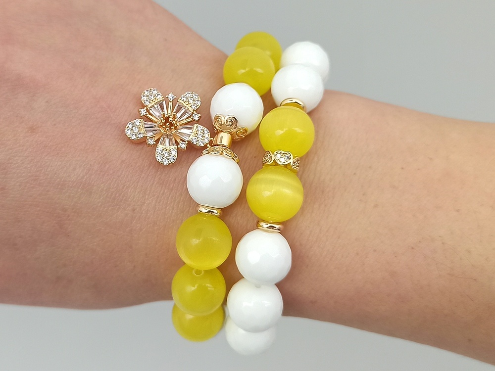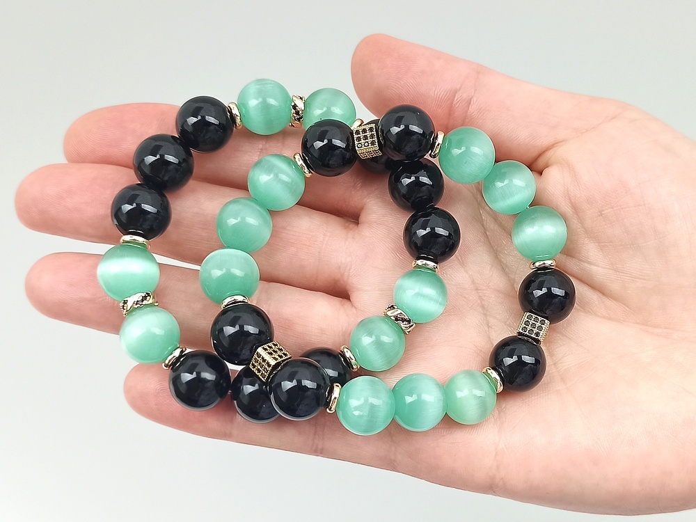 Мы собрали несколько ярких и сочных браслетов на резинке, использовав бусины с эффектом кошачьего глаза.