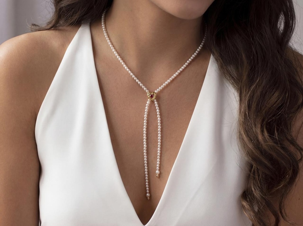 Учимся собирать простой, изящный чокер - галстук, используя в качестве центрального элемента коннектор для разделения нитей в форме сердечка с рубиновыми кристаллами. Основой украшения является ювелирный тросик. Белоснежный, идеальный по фактуре жемчуг майорка сделает ваш образ женственным и очаровательным.