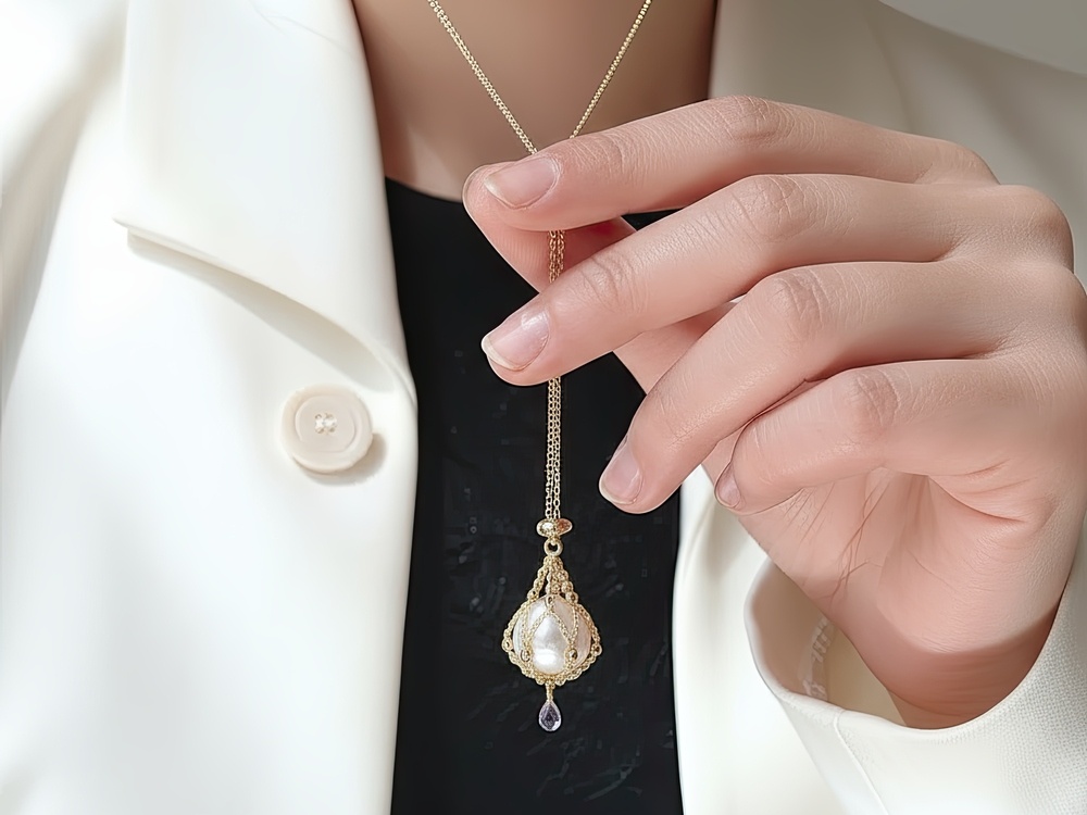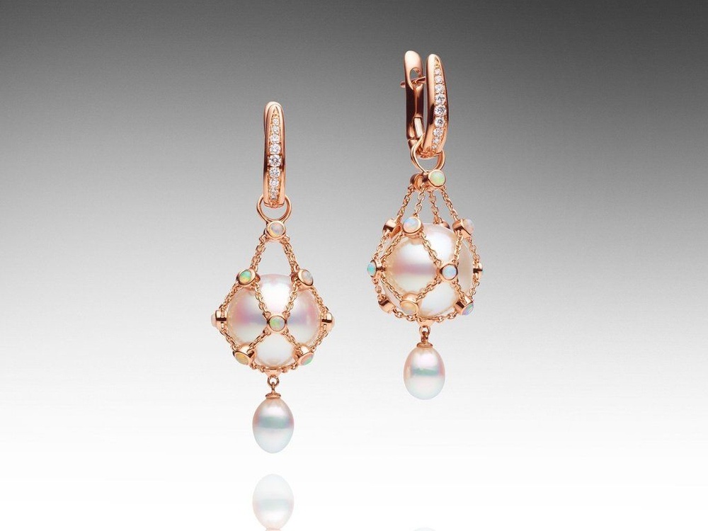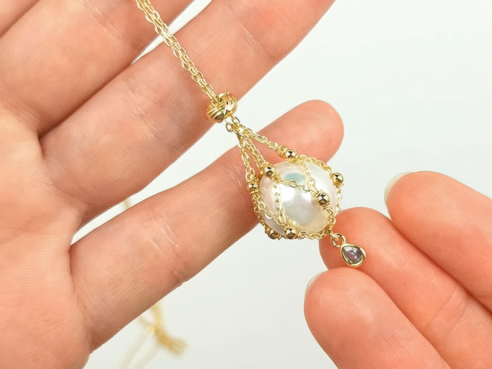 Роскошный кулон Lavalier украшает не только ожерелья, но и выполняет роль и подвески для серег. Дизайн украшения напоминает морские сети, в которые собирают устрицы-жемчужницы.