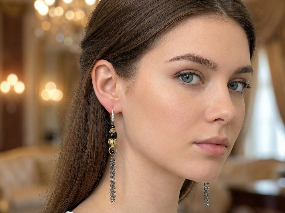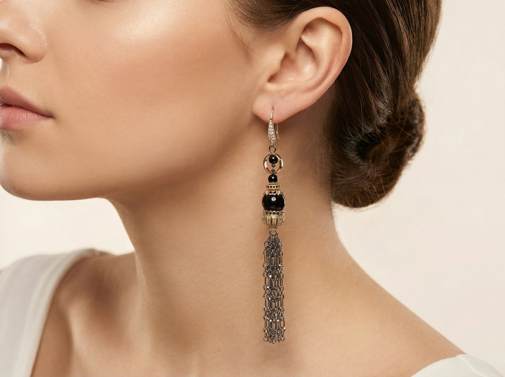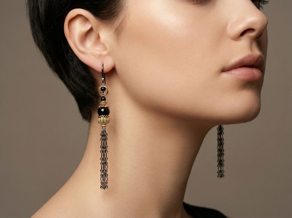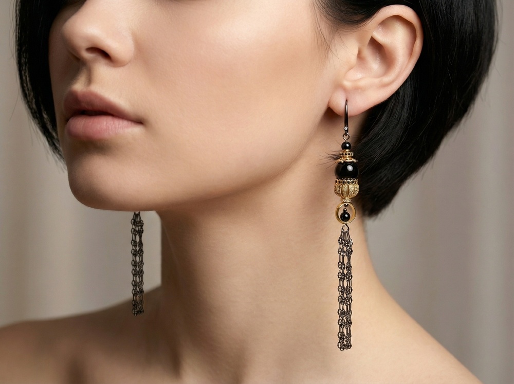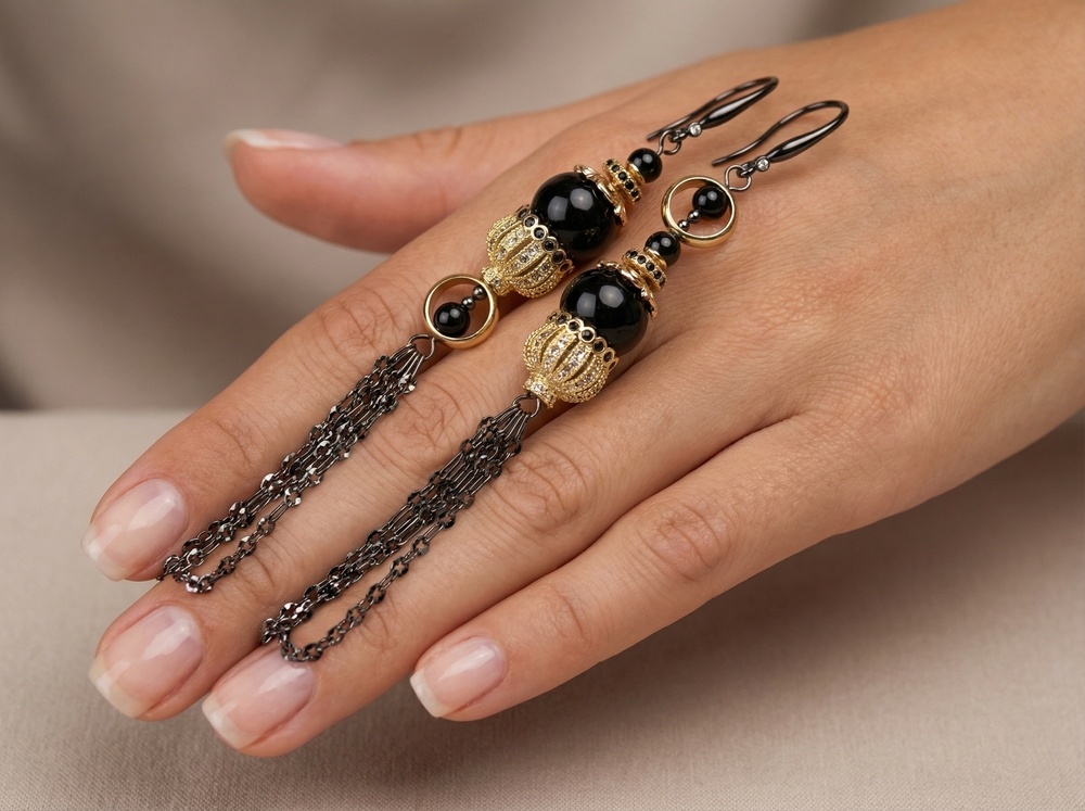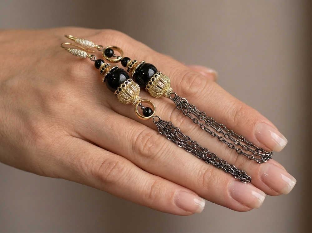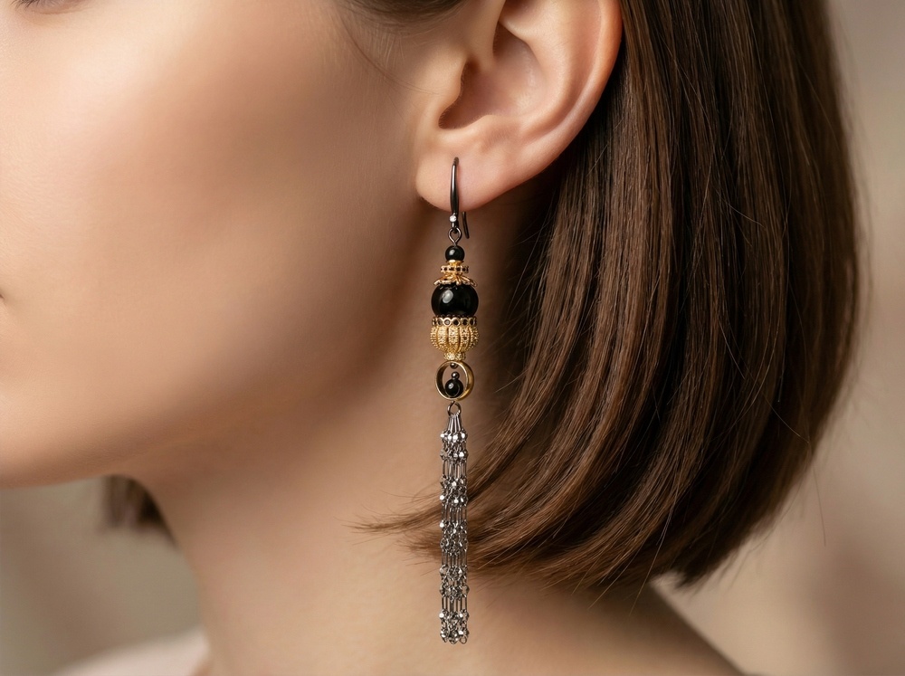 Мастер - класс по сборке асимметричных серёжек раскрывает нестандартный подход к работе с фурнитурой. В центре композиции - шапочки для кисточек, использованные в перевёрнутом виде. Такой приём превращает их в декоративный элемент, который обрамляет чёрные бусины и создаёт эффект ажурного купола. Контраст глянцевых тёмных акцентов и металлического сияния подчёркивается тонкими цепочками, собранными в лёгкую подвижную кисть.
