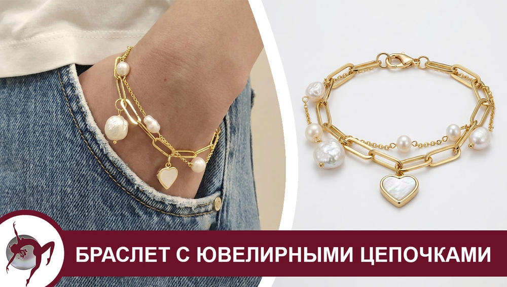 Мастер - класс, как собрать двухрядный браслет с ювелирными цепочками, жемчугом и подвесками сердечками
