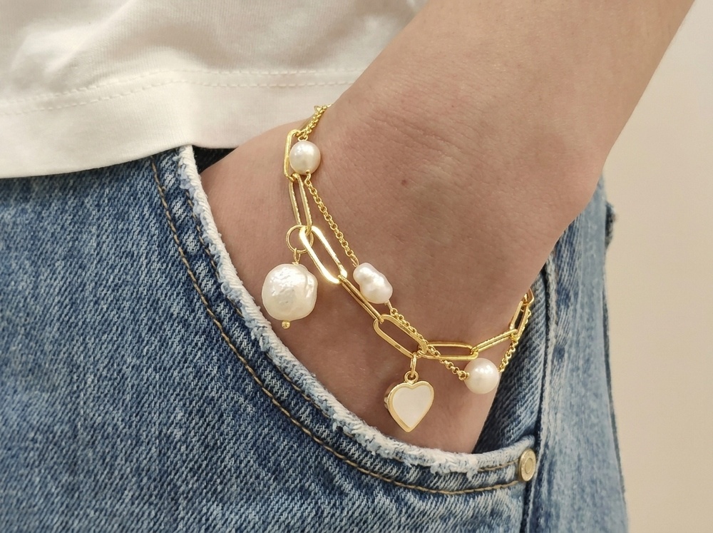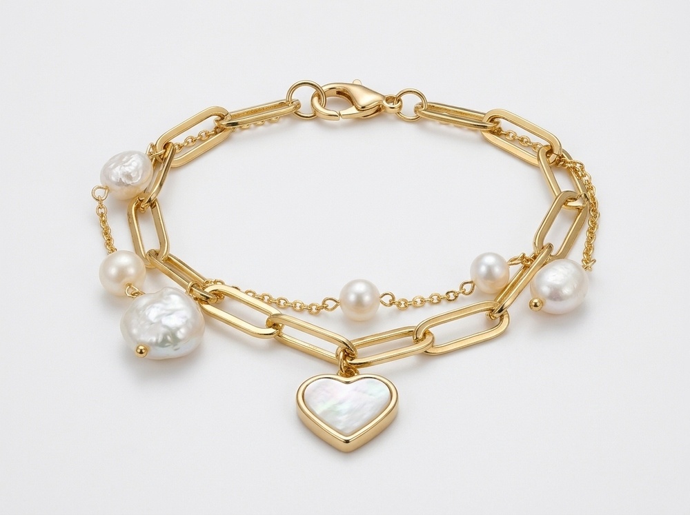 Мастер - класс посвящён созданию стильного браслета в современном стиле. Для сборки украшения используются две ювелирные цепочки: с овальными звеньями и мелкими декоративными элементами. Сначала собирается основа из крупных звеньев, затем к ней аккуратно крепится изящная цепочка с золотистыми шариками. После этого браслет украшается подвесками из натурального барочного жемчуга, сердечками ис белой эмалью и перламутра. Браслет собирается без использования кримпов, обжимной бусины, протектора для тросика и калот.