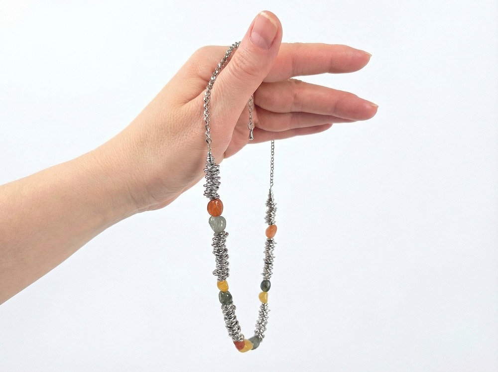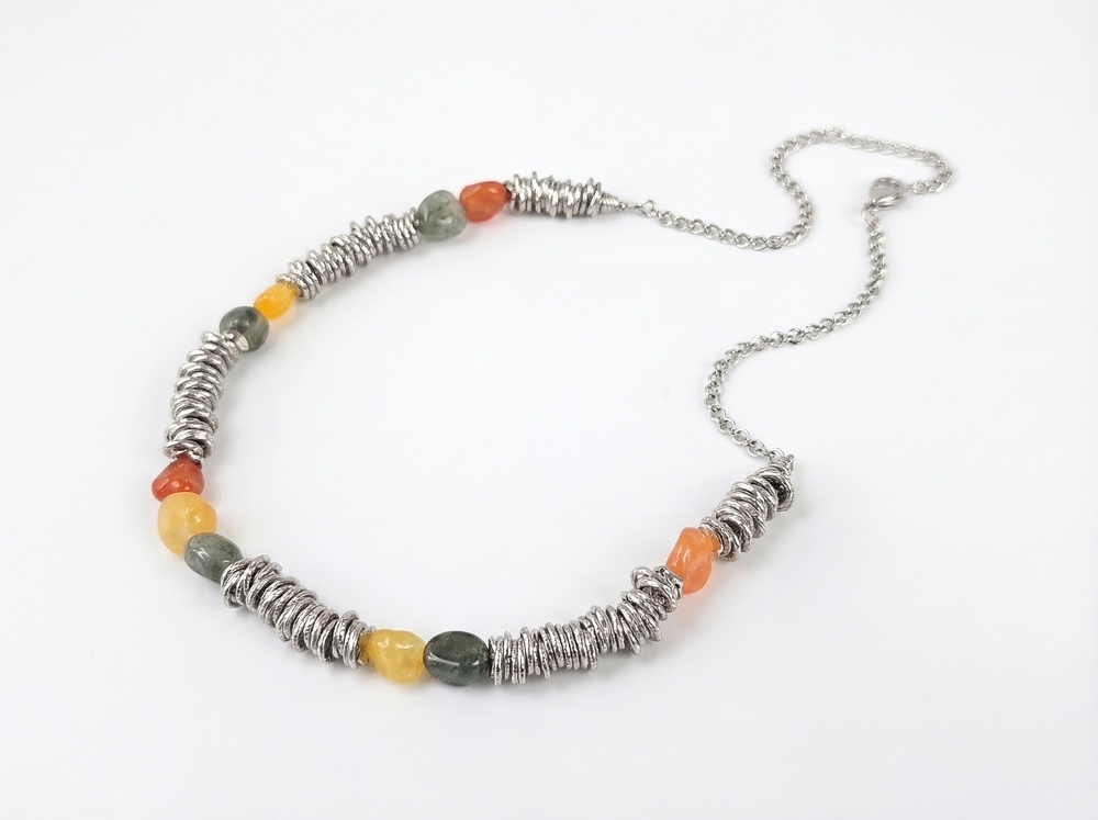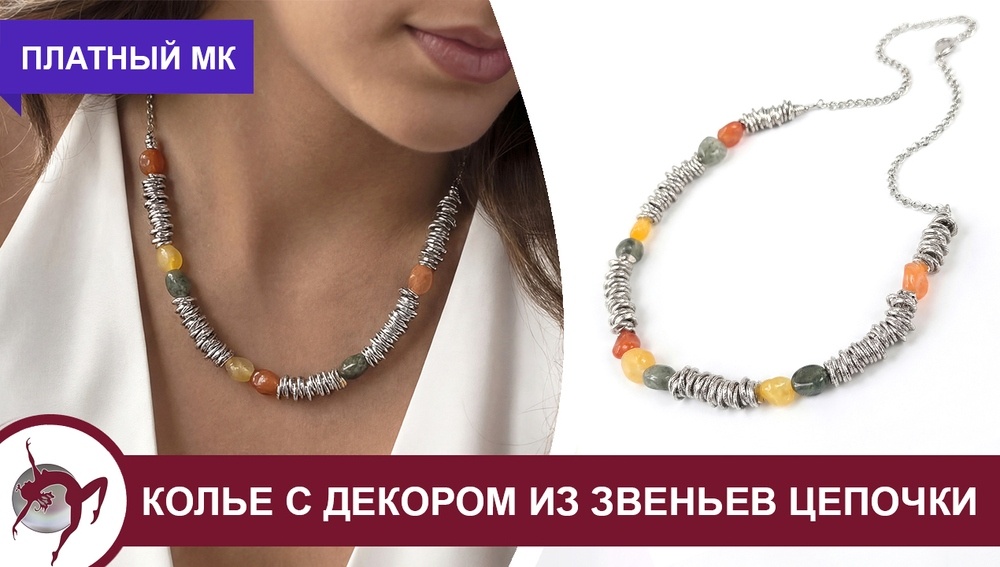 С помощью этого мастер - класса вы научитесь собирать колье с оригнальным декором из звеньев ювелирной цепочки. В работе используется интересный прием: звенья цепи формируют рельефную фактуру, а между ними размещаются яркие бусины галтовки сердолика и кварца. Блеск металла подчеркивает тёплые оттенки камней, создавая живой и динамичный рисунок украшения.