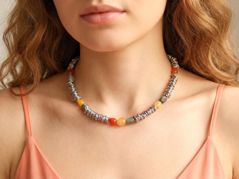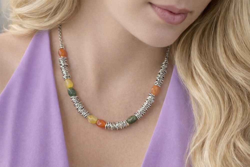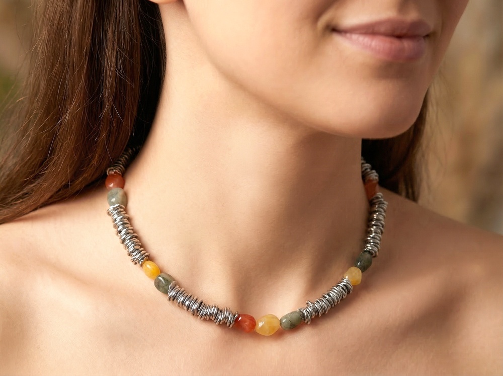 Колье с сердоликом и кварцем станет ярким акцентом повседневного образа. Его можно носить с однотонными блузами, льняными рубашками и платьями с открытым вырезом. Украшение гармонично дополняет стиль бохо и casual.