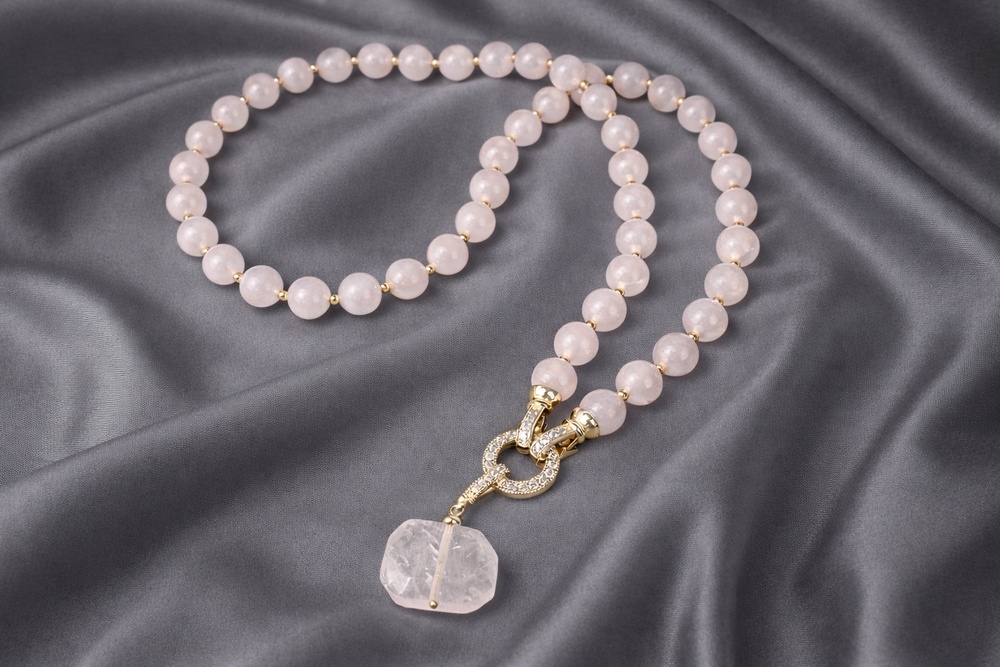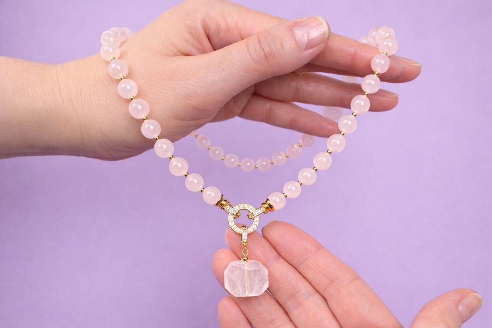 В центральной части соедините элементы замка и прикрепите бейл. На бейл подвесьте крупную гранёную бусину розового кварца - она превращается в изящную подвеску и становится главным акцентом украшения. Такое колье выглядит гармонично, подчёркивая мягкий блеск камня и изящность фурнитуры.