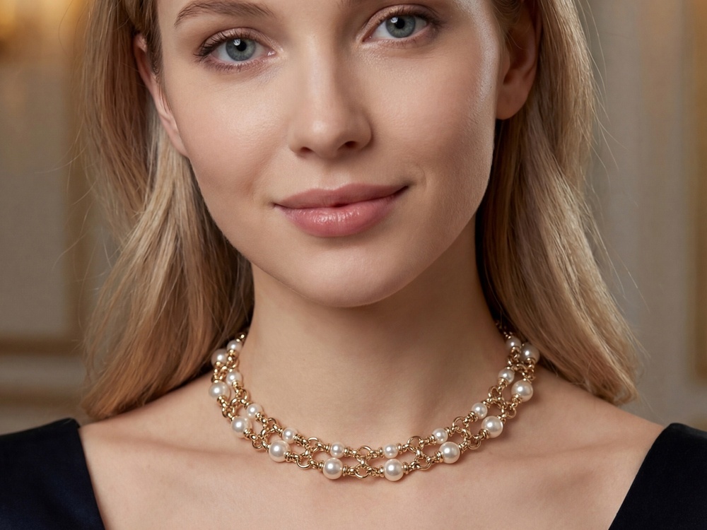 В дневных образах колье можно носить с лаконичными блузами, водолазками и минималистичными платьями, добавляя нотку элегантного шика. Жемчуг майорка универсален по цвету и фактуре, поэтому украшение подходит как для классического, так и для модного современного гардероба, подчеркивая индивидуальность и чувство стиля.