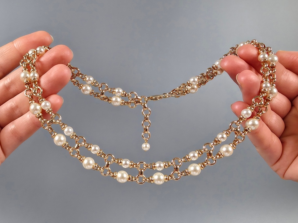 Мы собрали двухрядное колье в стиле Bulgari с жемчугом майорка, а в качестве фурнитуры использовали два вида фантазийных ювелирных цепочек. Жемчужины с идеально гладкой поверхностью создают ощущение роскоши и визуального объема, а ювелирные цепочки придают дизайну динамику и современный характер. Колье акцентирует линию шеи и ключиц, делая образ завершенным и выразительным.