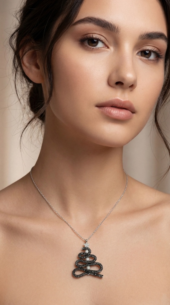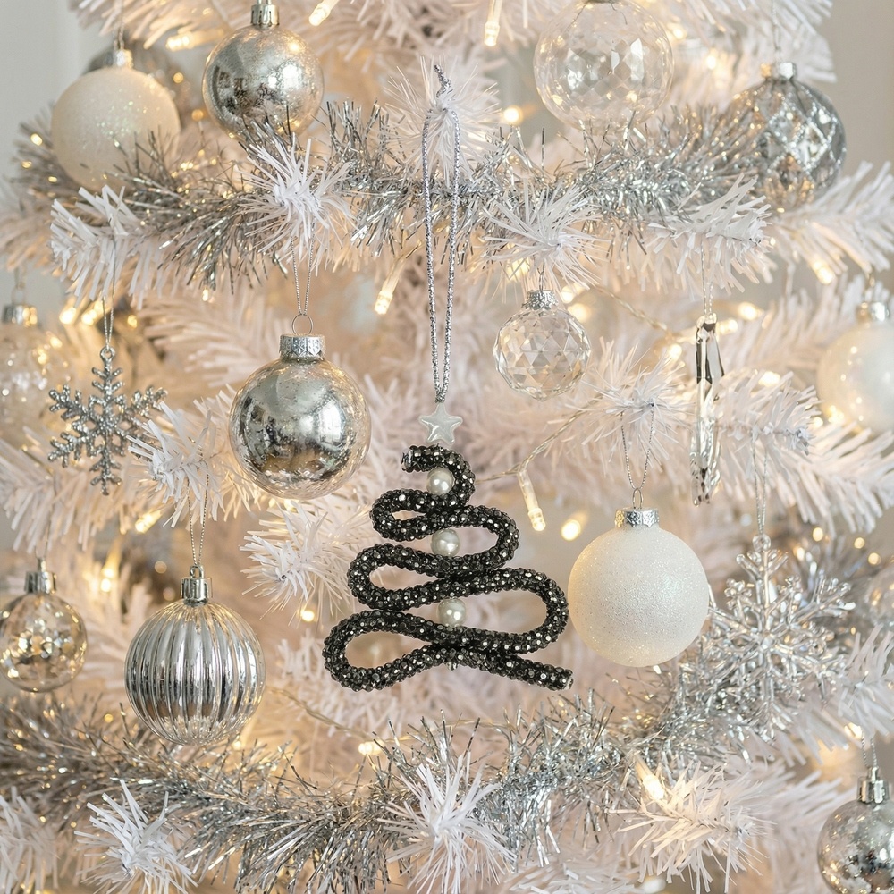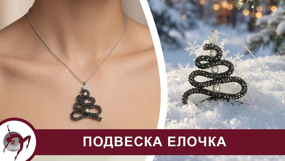 Для создания елочки мы использовали стразовый шнур, бусины жемчуга майорка 6 мм, прочную леску, пин и белоснежную бусину звездочку. Сначала сформировали силуэт: уложили шнур волнами, постепенно уменьшая ширину витков снизу вверх, создавая форму ёлки. Далее каждый виток аккуратно зафиксировали леской, не перетягивая, чтобы сохранить объём.