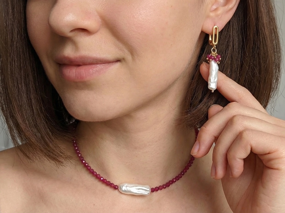 - Собираем серьги и чокер из красной шпинели и натурального жемчуга